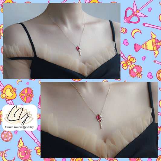 Collana Sailor Moon Scettro Magico - Cutie Moon Rod Ciondolo Argento Sterling 925 Cristalli Cubic Zirconia